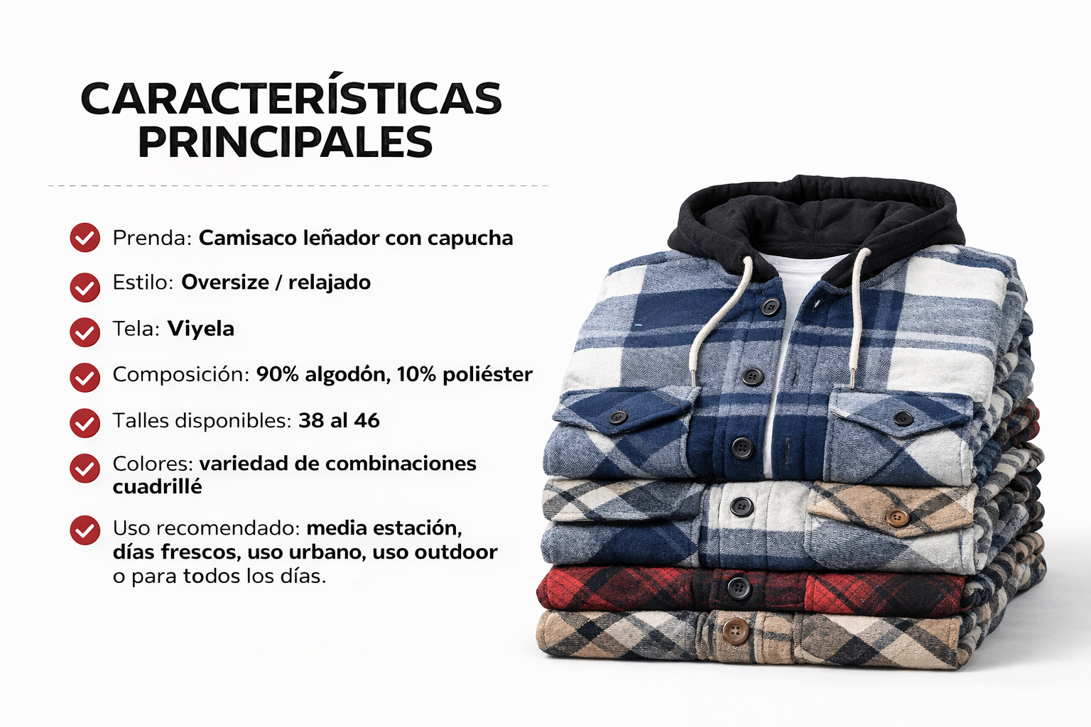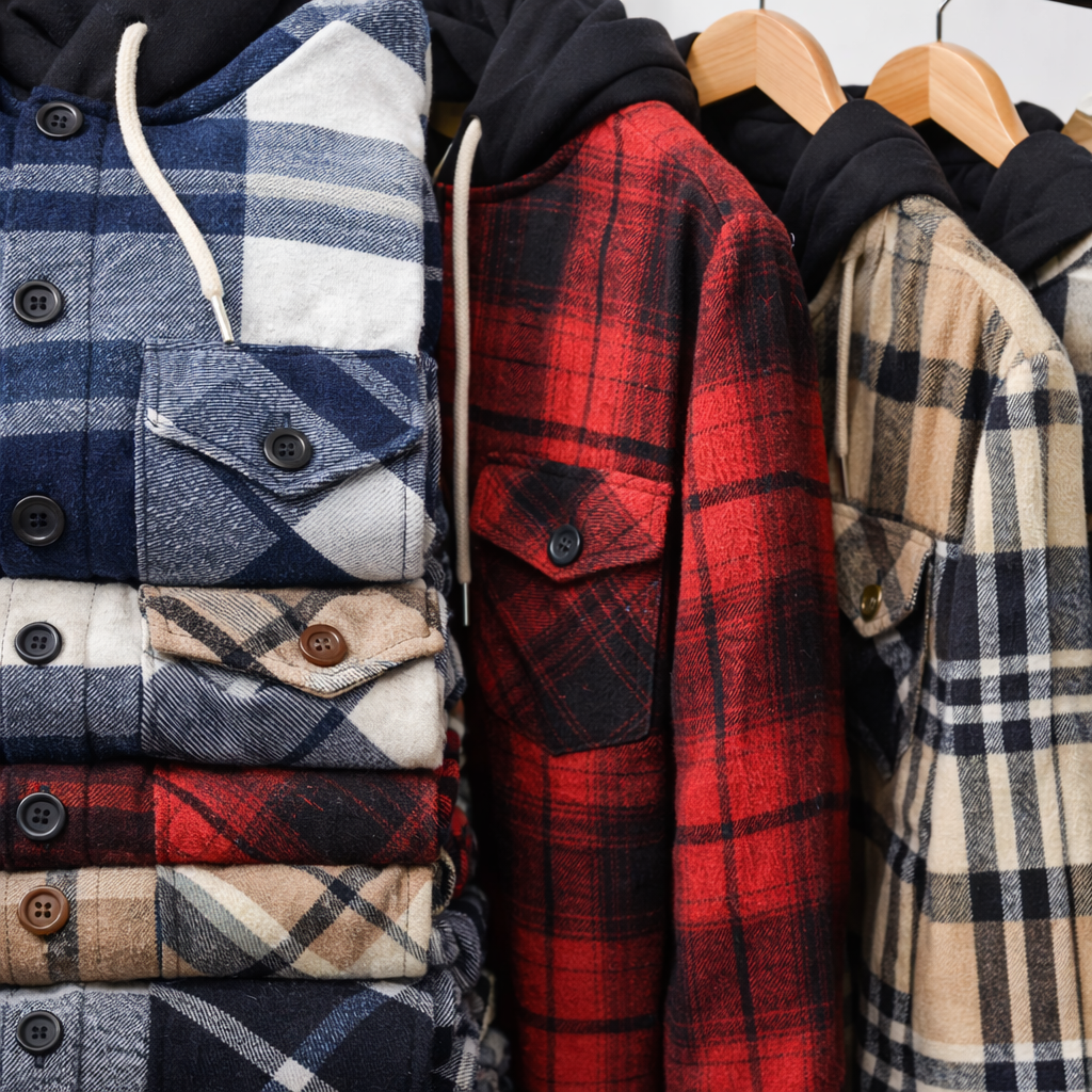 Este camisaco leñador cuadrillé con capucha combina el estilo clásico de la camisa leñadora con un toque urbano y relajado, ideal para media estación o para usar como sobrecamisa en días frescos.