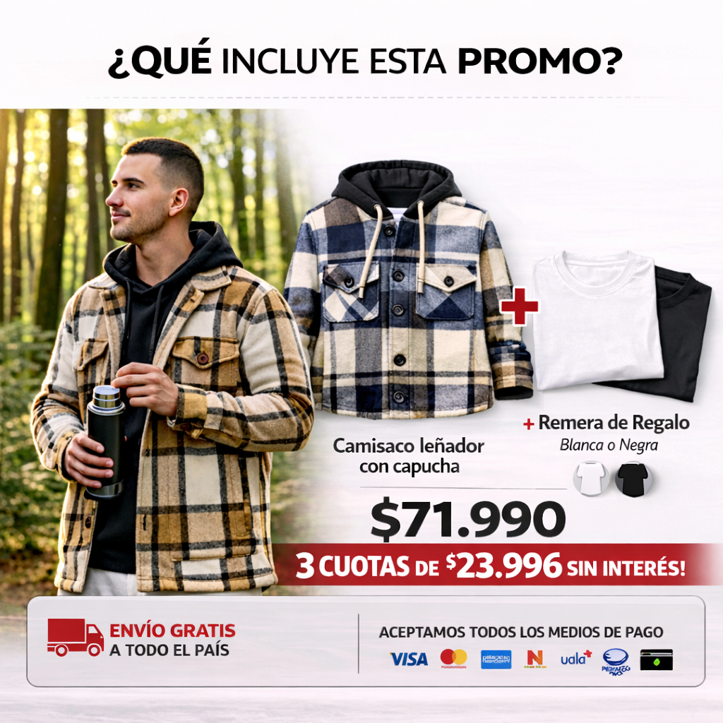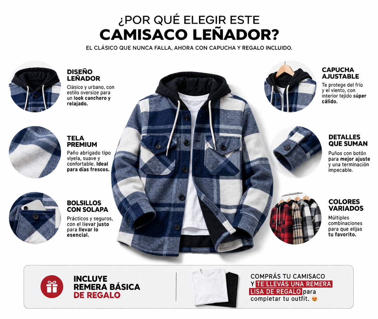 Llevate tu camisaco leñador con capucha + una remera básica lisa DE REGALO para completar el outfit sin gastar de más.